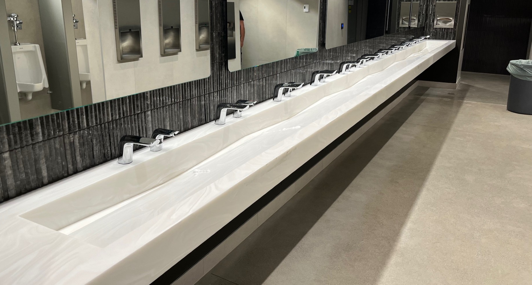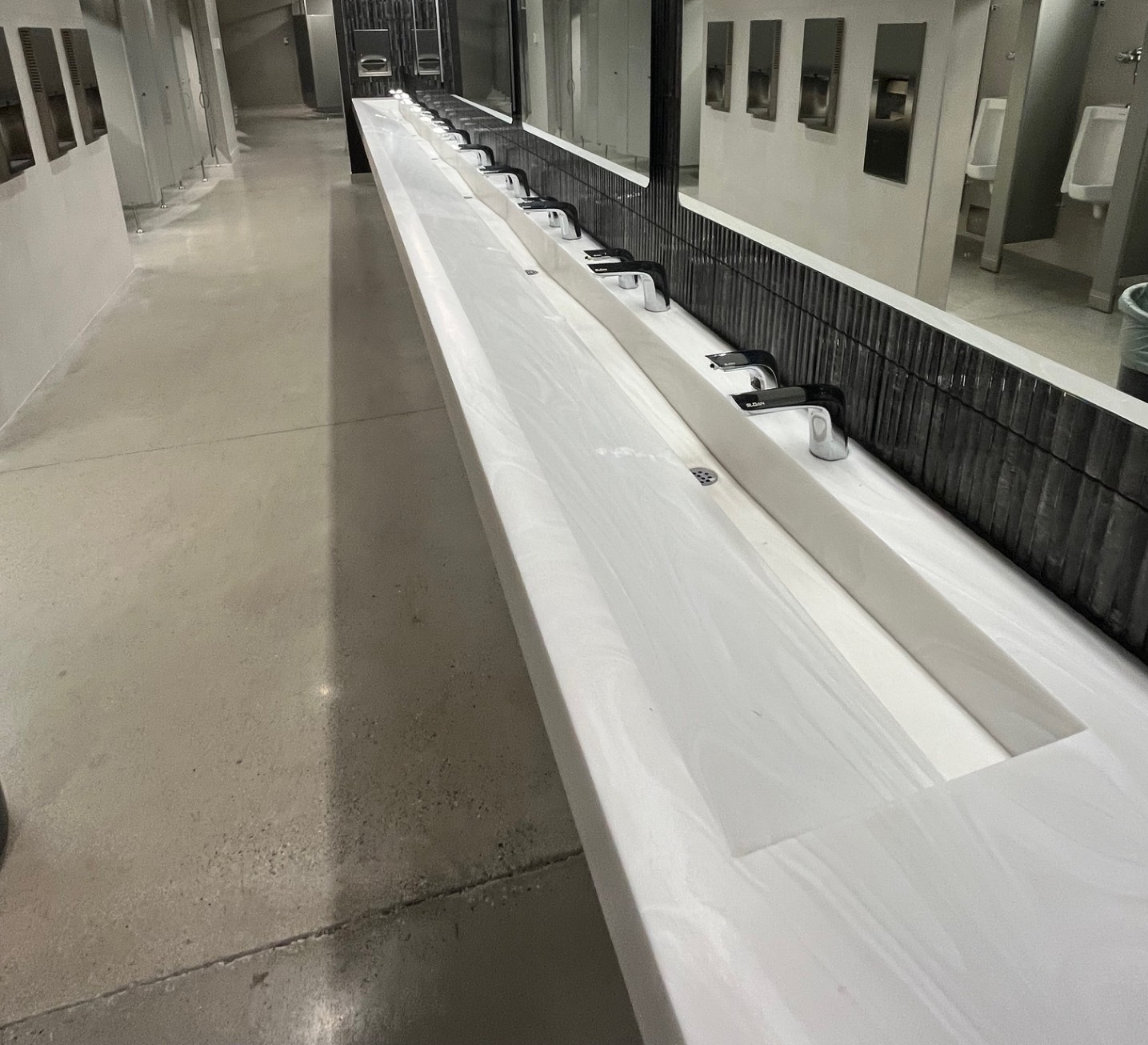 The project features a custom 11-station Sloan DSG Series sink, equipped with sensor-activated faucets and soap dispensers. Designed for high-capacity environments, the DSG system integrates handwashing components into a single, seamless unit — minimizing water on floors while maximizing hygiene, efficiency, and design continuity.