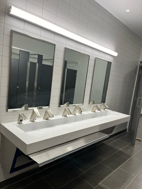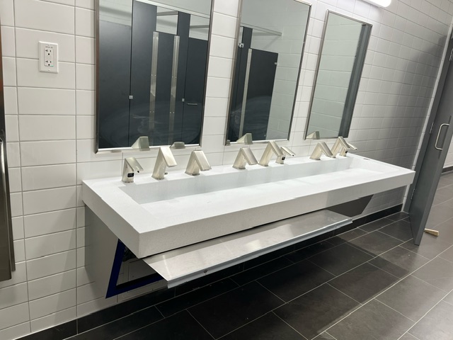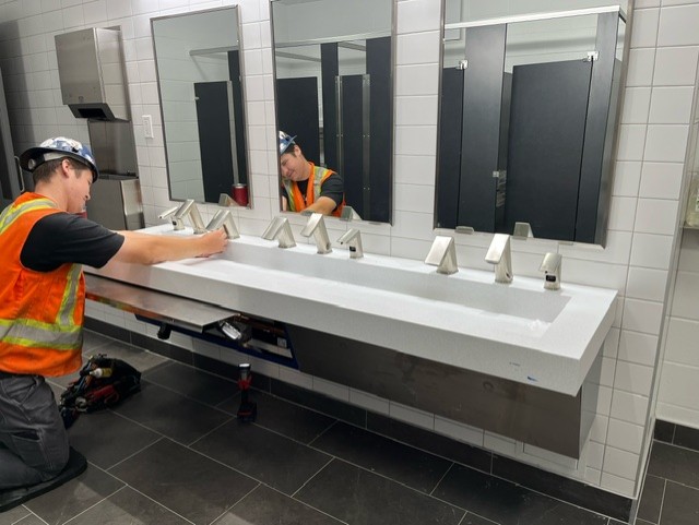 The Enbridge Gas facility in Ottawa showcases a sleek and functional washroom installation featuring Sloan’s cutting-edge sensor-activated faucet and hand dryer systems. The integrated sink stations combine touch-free soap, water, and drying technology to streamline user experience and minimize water on the counter. Paired with minimalist, polished solid-surface basins and stainless-steel underpanels, the space is designed for durability and hygiene. This hands-free setup not only reduces maintenance but elevates the overall aesthetic, reflecting a modern and efficient workspace environment.